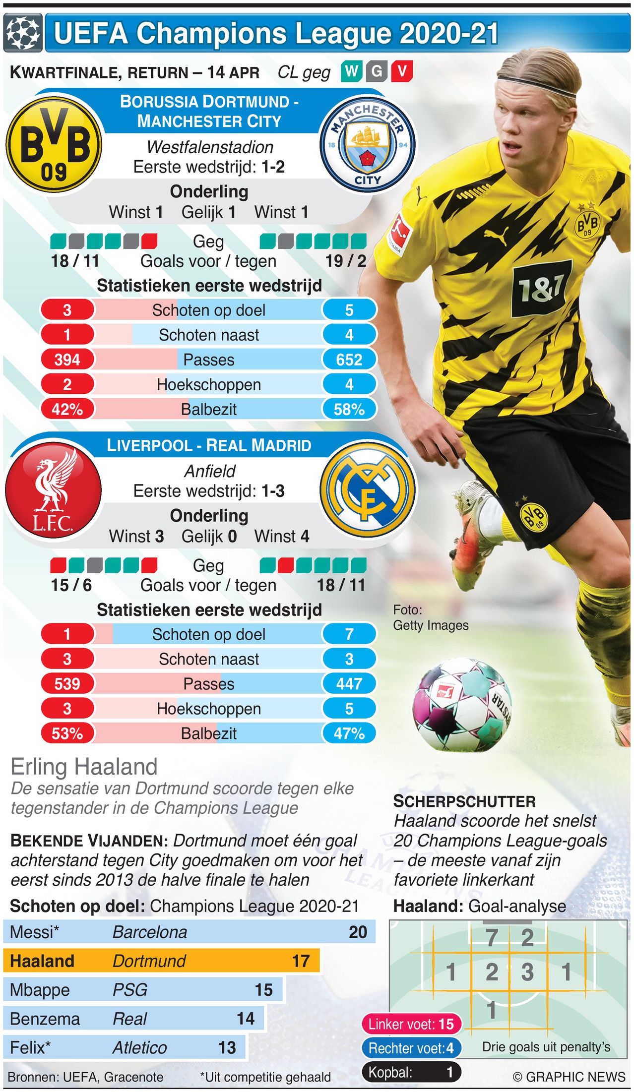 April 14, 2021 – Champions League Quarter-final first leg matches, including match-ups between Liverpool and Real Madrid at Anfield, and Borussia Dortmund against Manchester City at the Westfalenstadion.