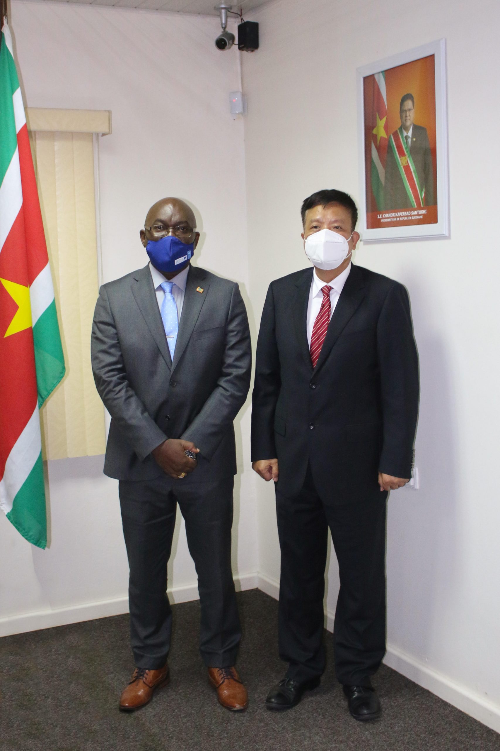 Minister van Justitie en Politie, Kenneth Amoksi heeft formeel kennis gemaakt met de Chinese ambassadeur Liu Quan. Dit bezoek had als doel het bespreken van de samenwerking tussen Suriname en China op het gebied van veiligheid alsook nog uitgevoerde projecten. De delegatie van de ambassadeur bestond verder uit Zongwei Chen, Economic en Commercial Counsellor, en de diplomaat Zhang Huyi, zo bericht het ministerie woensdagmiddag 14 april.