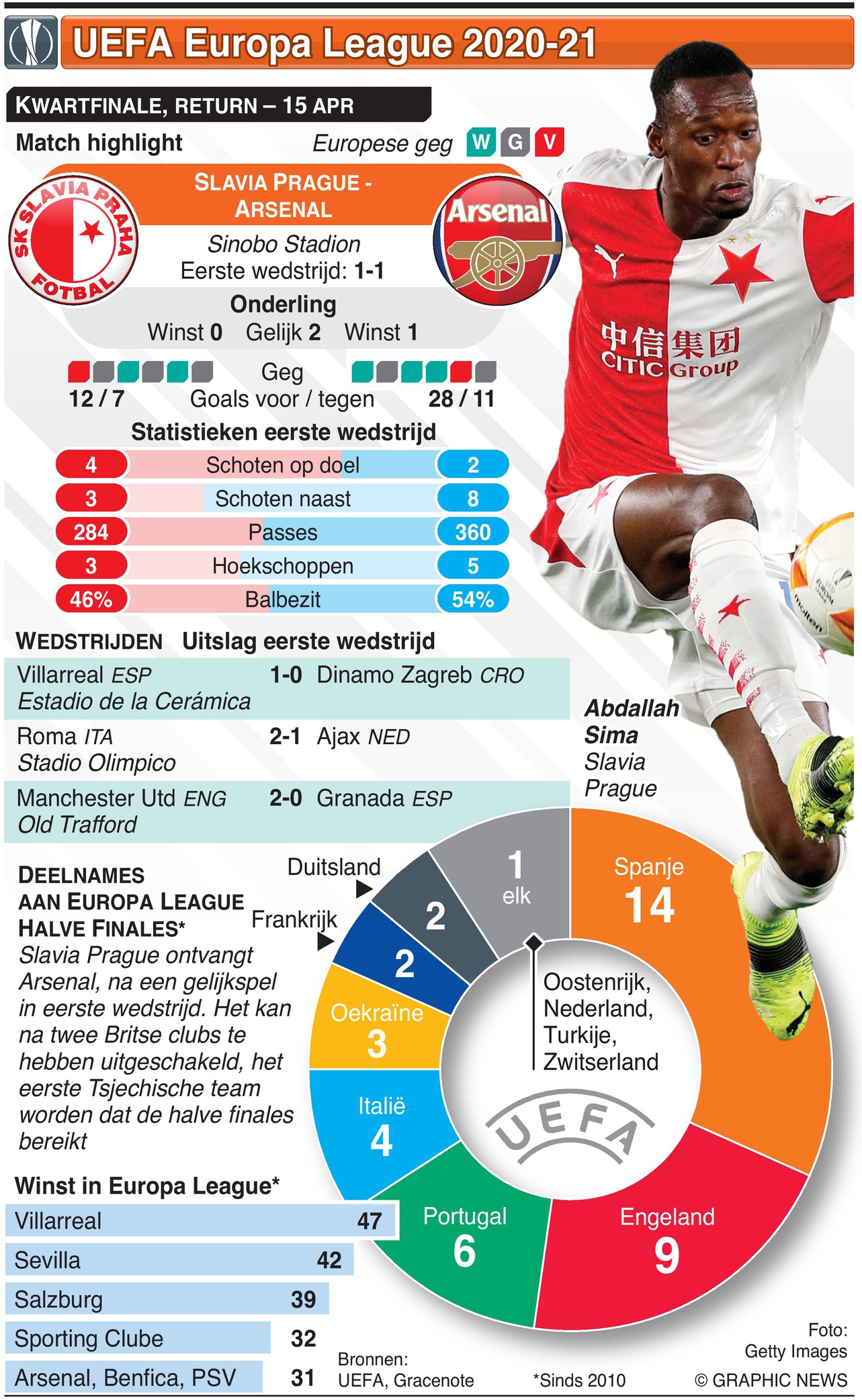 April 15, 2021 – UEFA Europa League Quarter-final second leg matches include a contest between Slavia Prague, who could become the first Czech team to reach the Europa League semi-finals, against 2019 finalists Arsenal. The first leg, at the Emirates, ended in a 1-1 draw.
