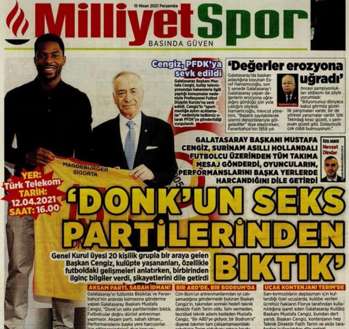 Galatasaray zit sportief in een moeilijke periode. De Turkse recordkampioen won in zijn laatste zes competitieduels slechts één keer en lijkt zo naast de titel te grijpen. Het was het sein voor Mustafa Cengiz om uit te halen naar zijn spelers. ‘De spelers moeten hun waardigheid en eer in acht houden. Ze zouden moeten vechten tot de dood. Waarom doen onze voetballers dat dan niet? Ik word er helemaal gek van. Ze zijn alleen maar bezig met hun premies.’ En, in de richting van Donk: ‘We zijn zijn seksfeestjes beu.’