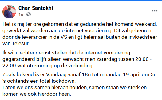āHet is mij ter ore gekomen dat er gedurende het komend weekend, gewerkt zal worden aan de internetvoorziening. Dit zal gebeuren door de leverancier in de VS en ligt helemaal buiten de invloedsfeer van Telesur.