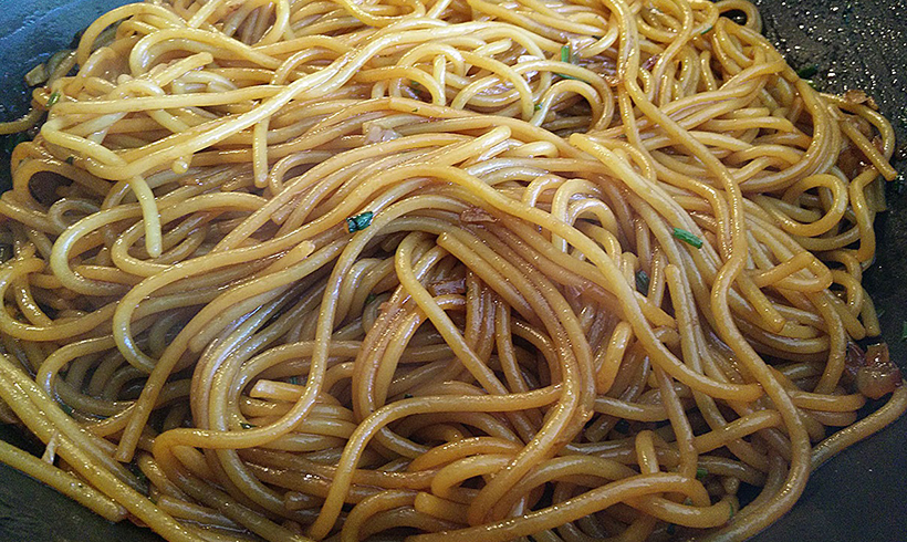 Breng water aan de kook met wat zout en een stukje laos, daarna de mie toevoegen en laten koken totdat het gaar is. In een vergiet doen en met koud water omspoelen zodat het niet plakt. De sojabrokken koken in water waaraan met 4 pimentkorrels, 1 teentje knoflook en salaamblaadje. Na 15 min. de brokken van het vuur afhalen, de pimentkorrels, teentje knoflook en het salaamblaadje verwijderen. De knoflook fijnwrijven. De sojabrokken marineren met de ketjap, de fijngewreven knoflook, ketoembar, stukjes laos en een beetje zout. De spitskool in fijne reepjes snijden. De selderij en de ui fijnsnijden. In wat olie de fijngesneden uitjes fruiten en de mie toevoegen en roerbakken. Daarna de sojabrokken, ketjap en zout toevoegen en blijven omscheppen. Als de mie bijna klaar is de spitskool en de fijngesneden selderij toevoegen en goed omscheppen.