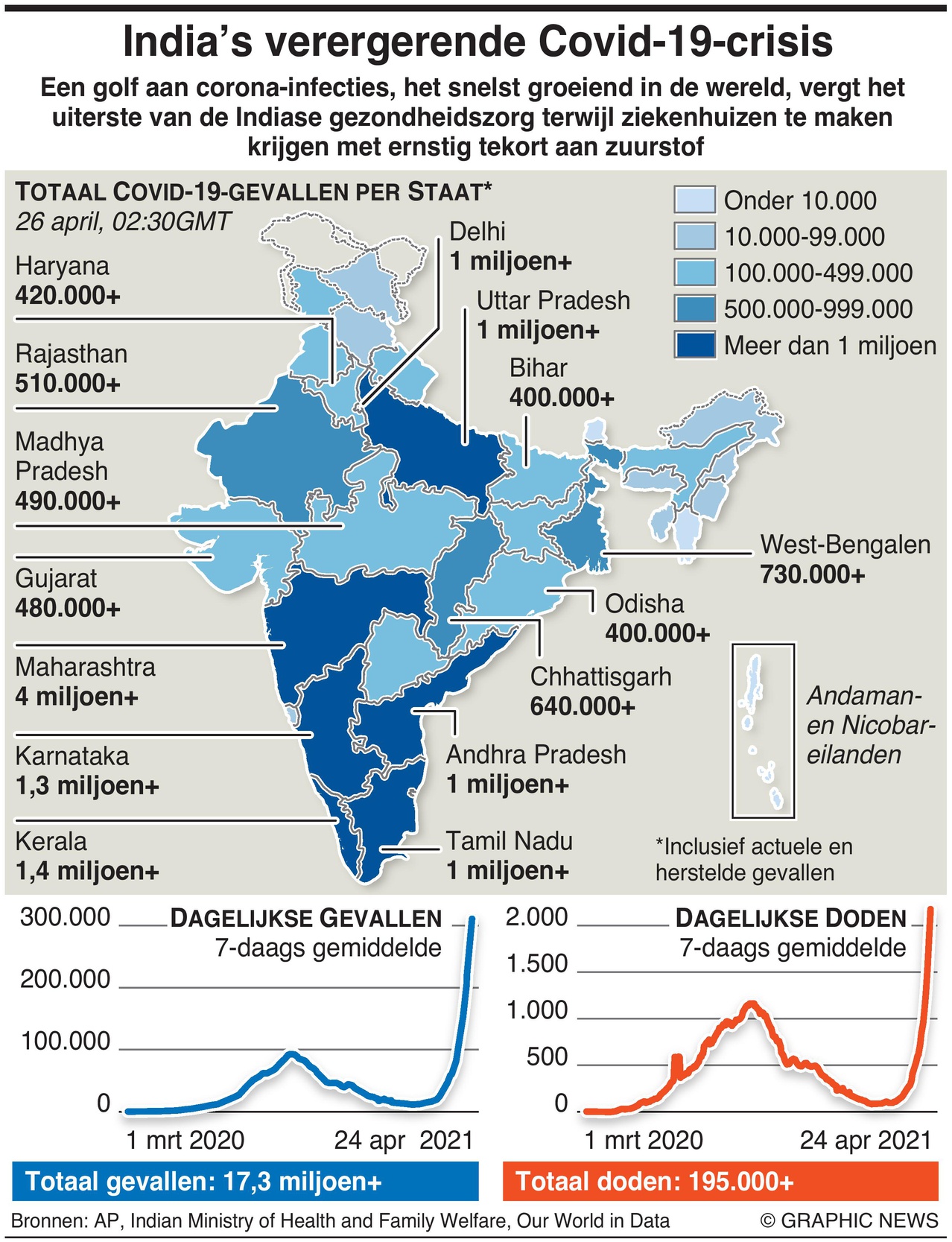 India is hard getroffen door een tweede coronagolf. Ziekenhuizen zijn overvol en er is een groot tekort aan zuurstof, beademingsapparatuur en medicijnen. Het aantal coronabesmettingen en overlijdens zijn de afgelopen weken fors toegenomen. Volgens de cijfers van de overheid worden er per dag meer dan 300.000 nieuwe besmettingen en meer dan 2300 doden gemeld.