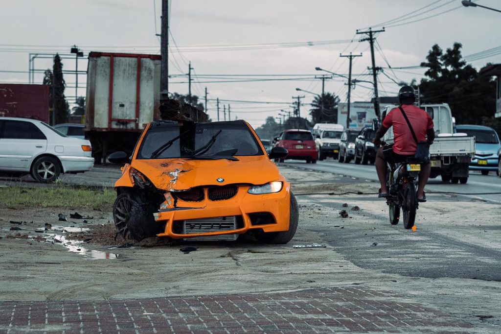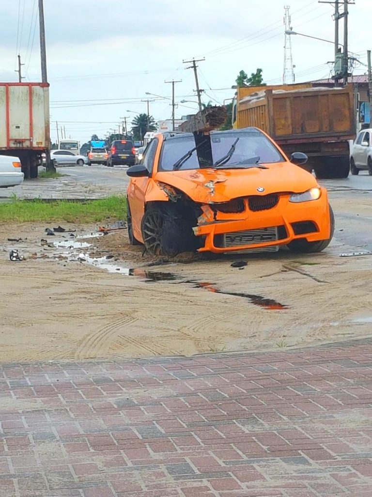 Op social media zijn donderdag 29 april beelden verschenen van een zwaar beschadigde opvallend oranje gekleurde luxe BMW in de berm langs de Indira Gandhiweg.