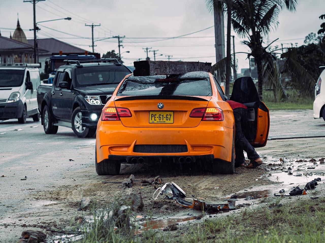 Op social media zijn donderdag 29 april beelden verschenen van een zwaar beschadigde opvallend oranje gekleurde luxe BMW in de berm langs de Indira Gandhiweg.