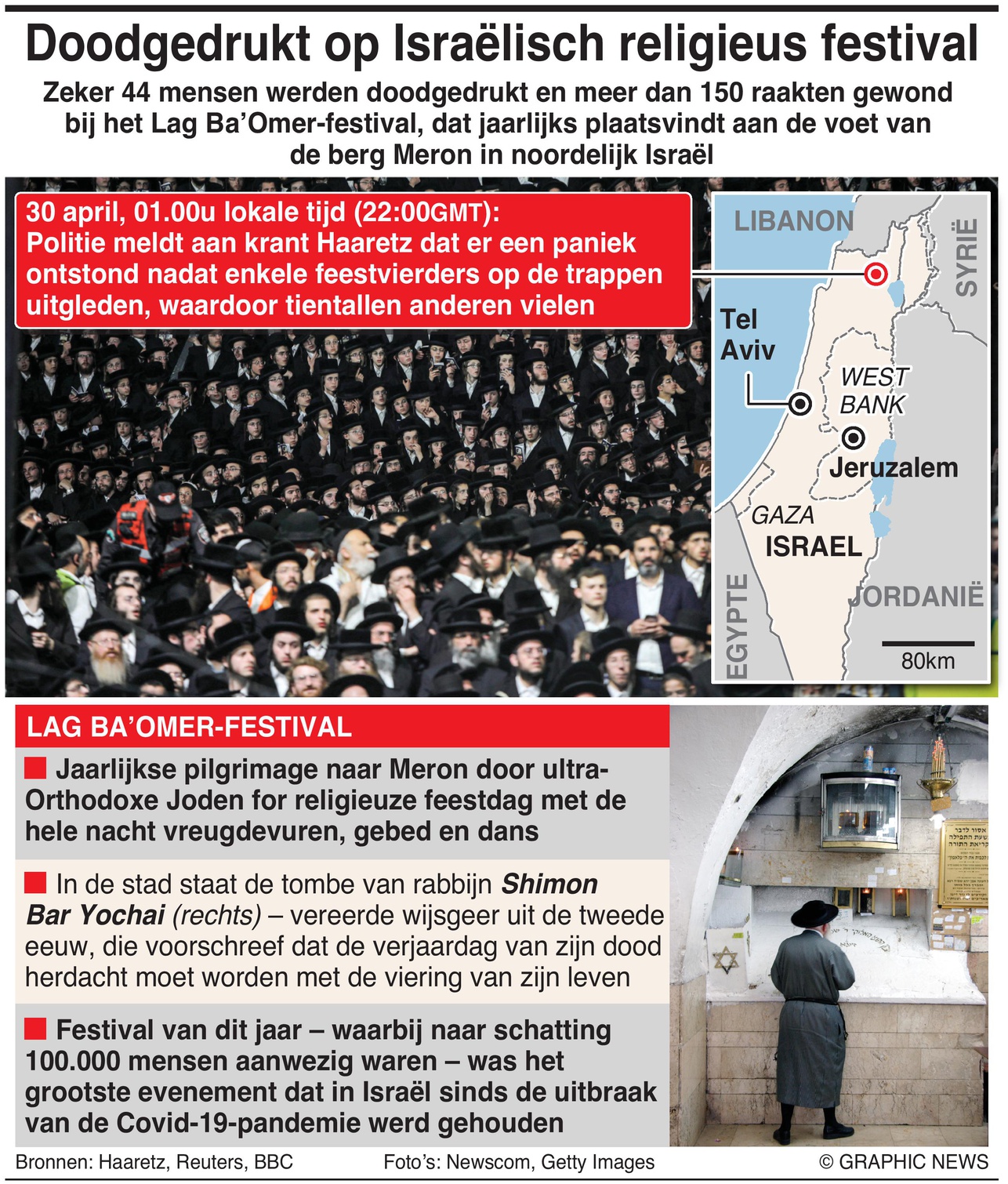 Bij een festival ter ere van het joodse feest Lag Baomer zijn in Israël volgens lokale media ten minste 44 doden gevallen door verdrukking. Onder de slachtoffers zouden ook kinderen zijn. Premier Netanyahu noemde de gebeurtenis op televisie “een grote ramp”.