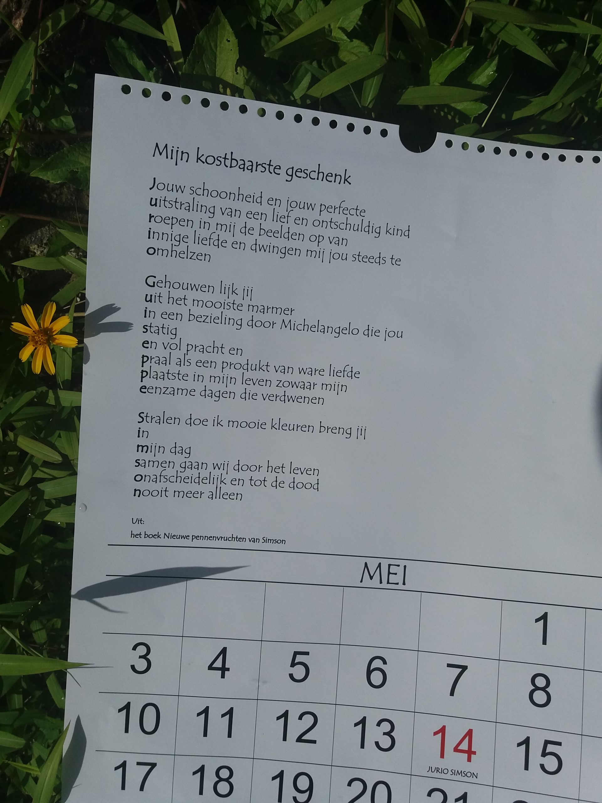 Ook om een groter publiek tegemoet te komen is ervoor gekozen om “Mijn kostbaarste geschenk” op te nemen op het meiblad van Kalender Waldy Simson 1. 14 mei is namelijk de geboortedag van Jurio Guiseppe Simson, de bron van ontstaan van het gedicht. “Met uw aanschaf van exemplaren van Kalender Waldy Simson 1, die nog zeker vier jaren geldig is, zult u samen met mij sociaal werk, dat in Suriname verricht zal worden, mogelijk helpen maken!”