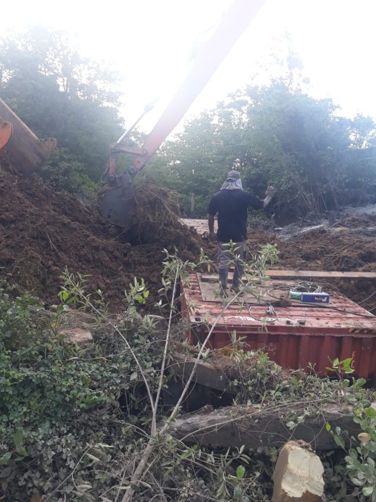 Het ministerie van Openbare Werken (OW) heeft in een persbericht bekendgemaakt, dat het ontstane gat in het weggedeelte ter hoogte van Dordrecht – nabij de oude sluis aan de Commissaris Thurkowweg te Jagtlust, in het district Commewijne – is gevuld met een zeecontainer.