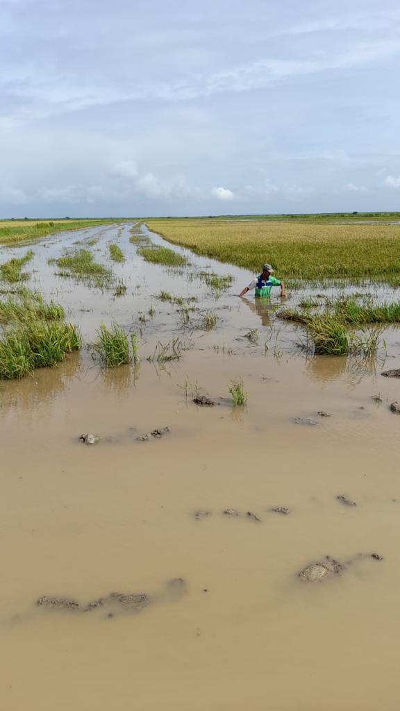In het najaarsseizoen was er circa 32.700 hectare aan padi ingezaaid. Tot eind april moest er nog circa 7.800 hectare worden afgeoogst. Hoeveel hiervan ondertussen is afgeoogst is niet bekend. Wel was bekend dat een groot deel van de nog in veld staande padi onder water stond en dat het afoogsten enorme problemen ondervindt.