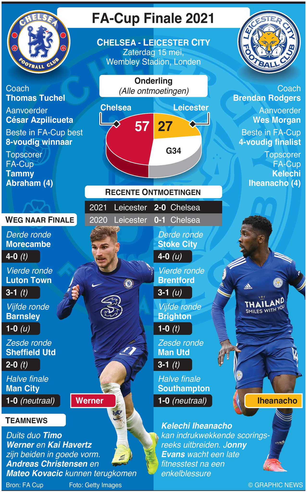 Opponents Leicester City are targeting their very first FA Cup trophy. They have made four previous appearances in the final, but none since 1969, and failed to clinch the silverware each time. The Foxes, who are on course to secure a Champions League berth via their Premier League performance, beat Stoke City in the third round and followed up with victories over Brentford, Brighton and Manchester United. A second-half strike by Kelechi Iheanacho in their semi-final win over Southampton sealed their Wembley berth.
