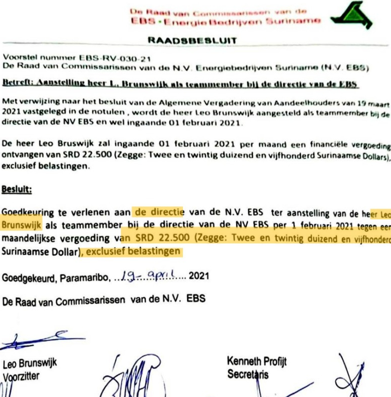 Leo Brunswijk, broer van vicepresident Ronnie Brunswijk, blijkt per 1 februari van dit jaar te zijn aangesteld als ‘teammember’ binnen de directie van de NV Energiebedrijven Suriname (EBS).