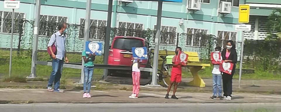 Hierbij staan vrijwilligers langs wegen in Paramaribo met borden om de bewustwording te vergroten voor veilig verkeer in Suriname. Lagere snelheden redden levens en zijn het hart van elke gemeenschap. 30 km/u maximum toegestane snelheid waar mensen en verkeer samenkomen. “We roepen beleidsmakers op de maximale toegestane snelheid van 30 km/u