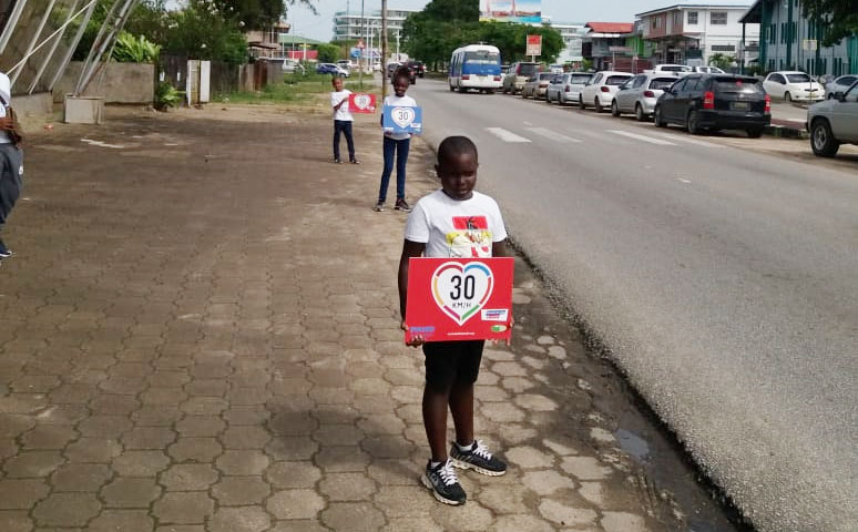Hierbij staan vrijwilligers langs wegen in Paramaribo met borden om de bewustwording te vergroten voor veilig verkeer in Suriname. Lagere snelheden redden levens en zijn het hart van elke gemeenschap. 30 km/u maximum toegestane snelheid waar mensen en verkeer samenkomen. “We roepen beleidsmakers op de maximale toegestane snelheid van 30 km/u