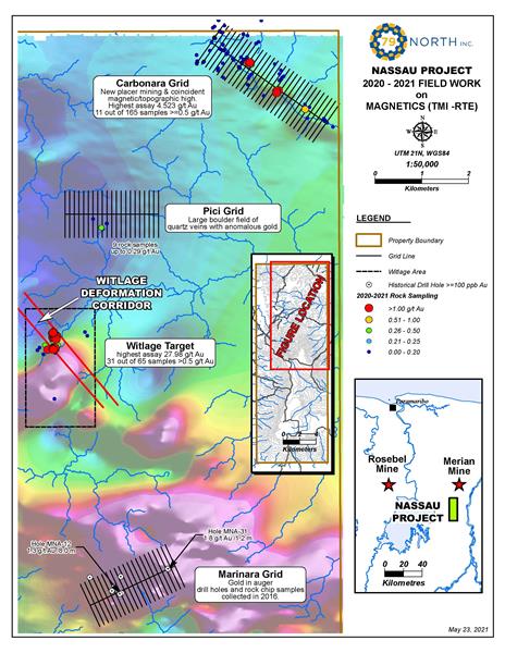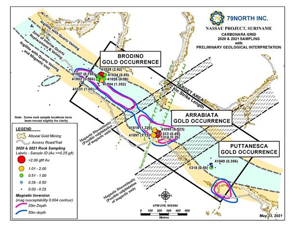 Het Canadese bedrijf 79North Inc. (https://79north.ca/) heeft een nieuwe ontdekking gedaan op het 20.000 hectare grote Nassau-gebied in Suriname, ongeveer 20 kilometer ten zuiden van de Merian-goudmijn in Newmont en 60 kilometer ten oosten van de Rosebel/IAmGold goudmijn in Brokopondo. 79North Inc. opereert als een exploratiebedrijf voor mineralen. Het bedrijf richt zich op de verwerving, exploratie en ontwikkeling van eigendommen voor de winning van goud en andere mineralen. Dit meldt GlobeNewswire woensdag 26 mei.