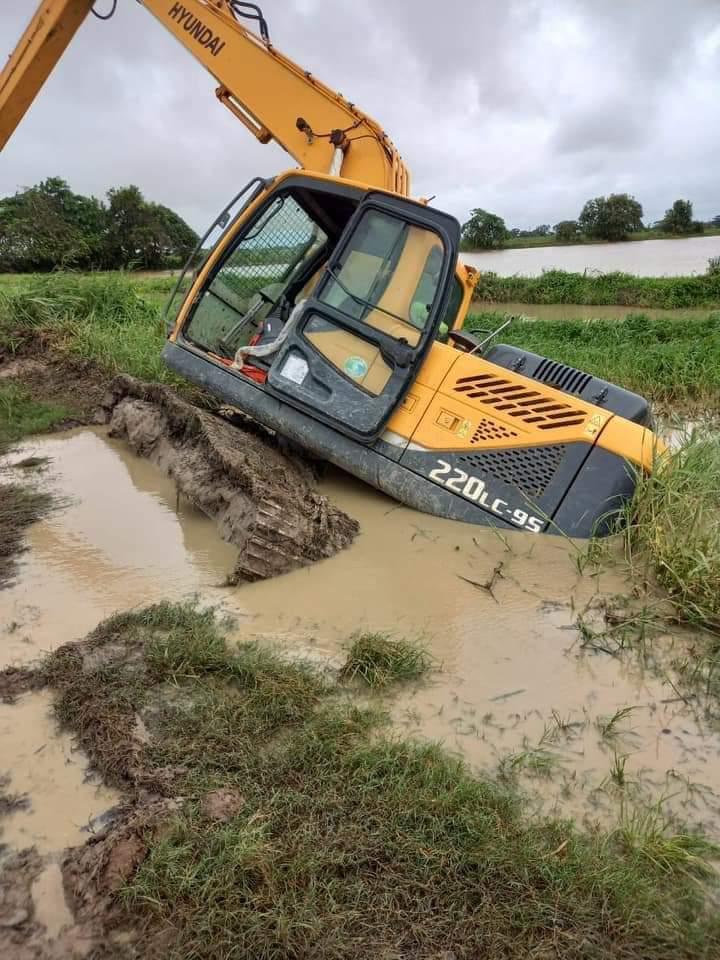 Een graafmachine van het ministerie van Openbare Werken is woensdag tijdens opschoningswerkzaamheden van een kanaal weggezakt in de modder. De graafmachine was aan het werk langs de Rajaramweg in Nickerie.