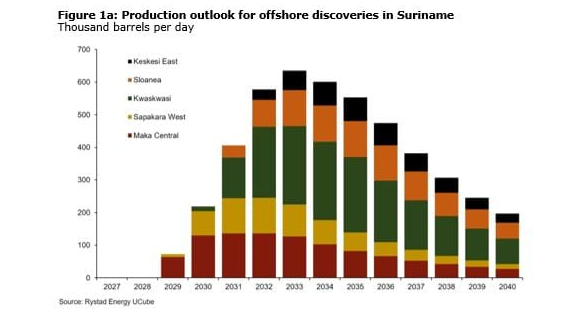 “We verwachten dat de netto contante waarde van projecten op de 11 actieve blokken van Suriname aanzienlijk zal zijn, met een potentieel om aanzienlijke kasstromen te genereren voor zowel Staatsolie als internationale oliemaatschappijen, zelfs in een omgeving met lage olieprijzen.” Rystad Energy verwacht dat de productie van Blokken 58 en 52 zal beginnen aan het eind van dit decennium en dat het kan groeien tot ongeveer 650.000 vaten per dag in het begin kan 2030.
