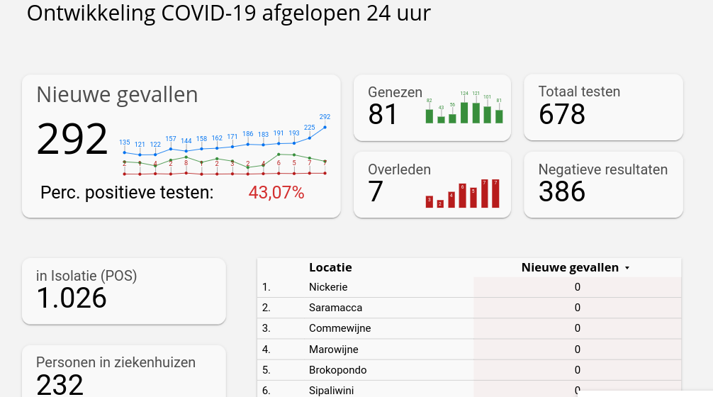 292 Personen zijn donderdag positief getest (woensdag 225) en 81 patiënten zijn genezen verklaard. 678 Testen zijn uitgevoerd.