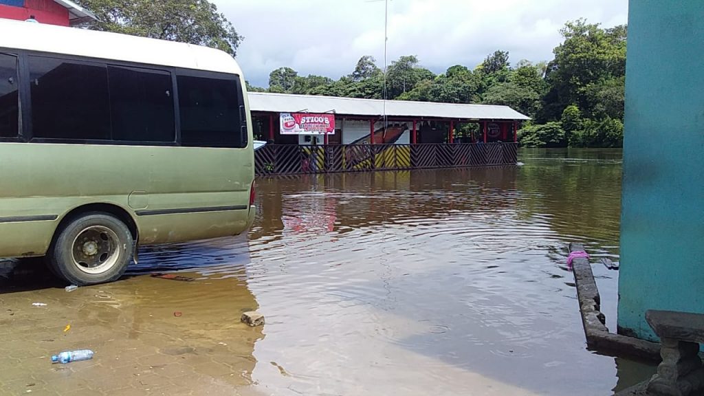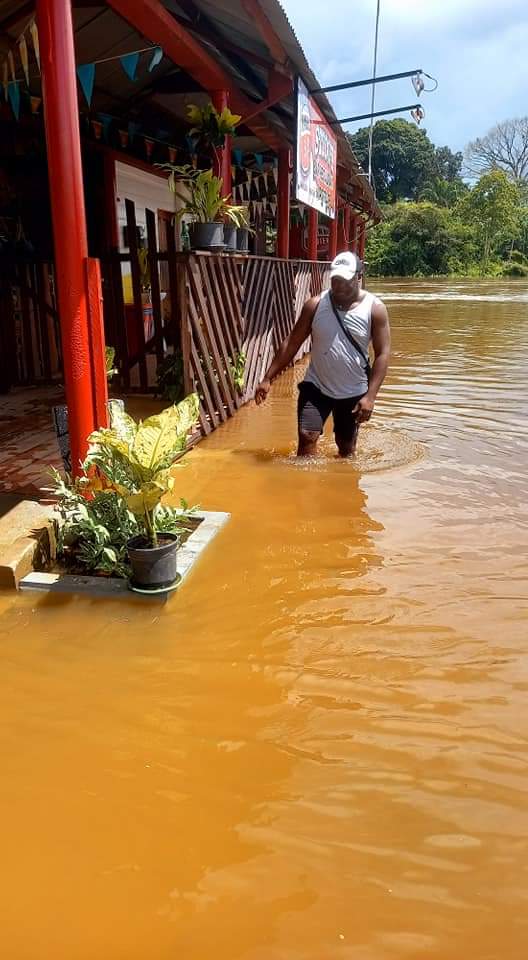 Atjoni aan de boven Surinamerivier in het district Sipaliwini, is onder water gelopen, door de hoge waterstand van de rivier.