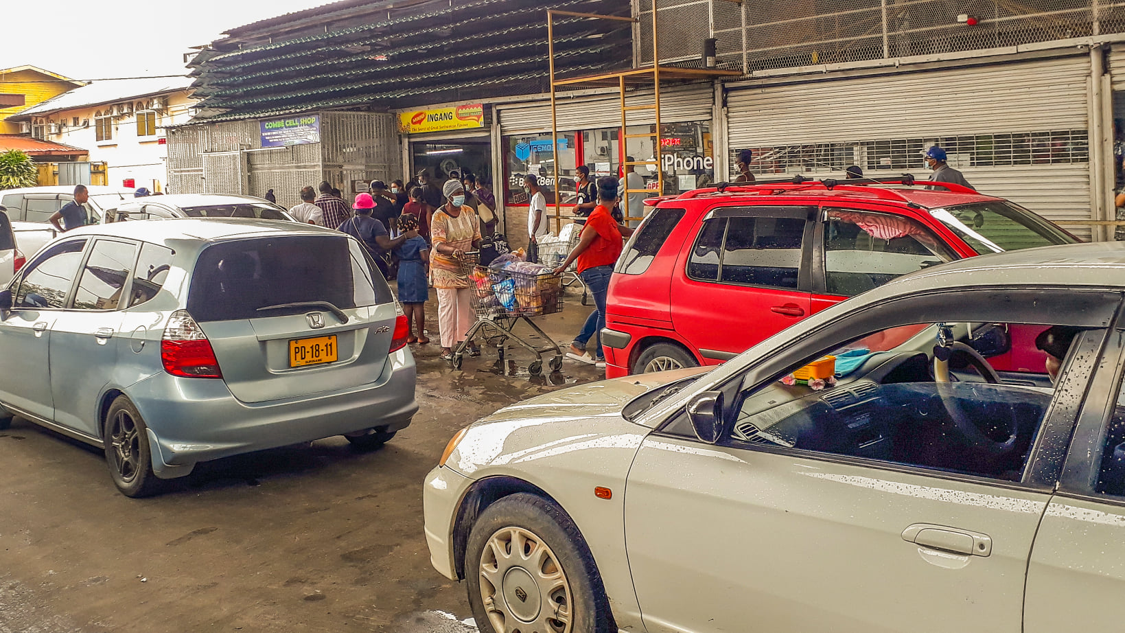 Lange rijen overal, tergend langzaam voortbewegende files in het verkeer, miezerig regenweer, frustraties en irritaties bij de burgerij, zo was het beeld en de sfeer maandagmorgen 31 mei in Groot Paramaribo en aangrenzende districten Wanica en Commewijne.