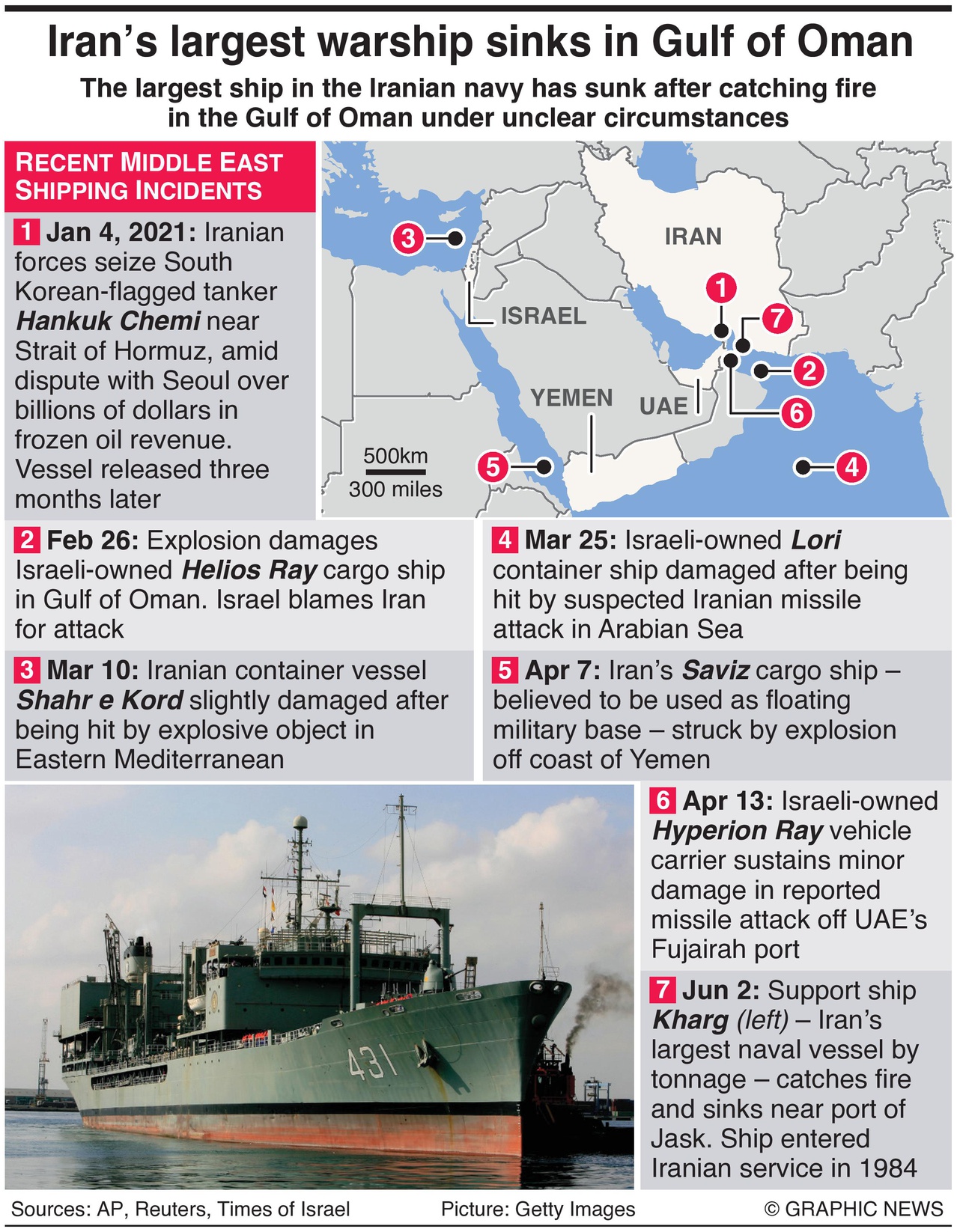 Een bevoorradingsschip van de Iraanse marine is gezonken in de Golf van Oman nadat de hulpdiensten urenlang vruchteloos een brand aan boord onder controle probeerden te krijgen. Dat heeft de marine woensdag laten weten. De bemanning van de Kharg kon op tijd ontzet worden.