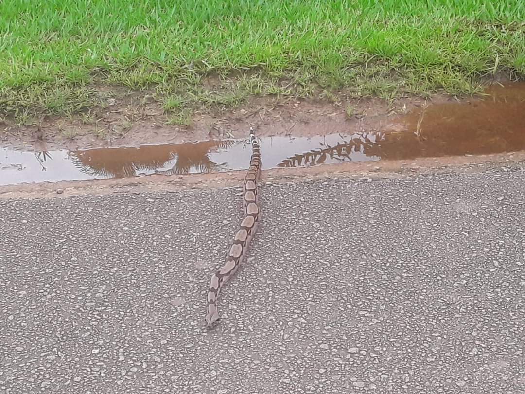Er is weer een slang gespot in Brokopondo centrum, tegenover het Zunta gebouw, naast het commissariaat. Met dit weer komt allerlei ongedierte de droogte opzoeken. Deze keer is het een zogenoemde tapijtslang.