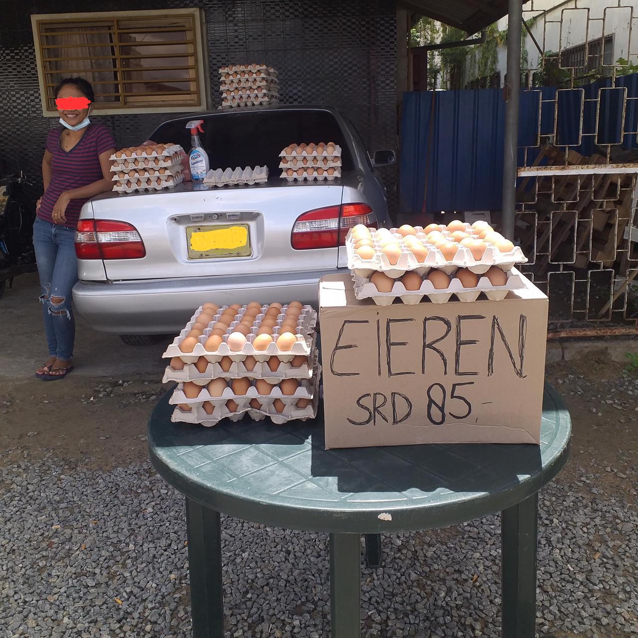 Zoals hier op de foto te zien: een klein zelfstandige pluimveehouder die haar eieren letterlijk niet aan de man kan brengen, maar tracht de āman (lees: klant) naar de eieren te brengenā. Simpel een tafeltje voorin op het erf met daarop haar product en de prijs.