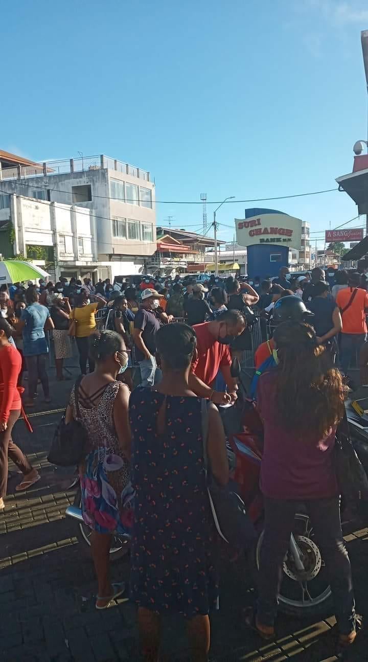 Vanwege de sterk verslechterde economische situatie in het land krijgen velen van familieleden in het buitenland valuta opgestuurd als ondersteuning in de sterk toegenomen kosten van vooral levensonderhoud. Het geld ontvangen ze bij de verschillende geldovermakingskantoren zoals Western Union en SuriChange. Vanwege de lockdown zijn de geldovermakingskantoren nu slechts drie dagen in de week open. Ook de openingstijden zijn nu sterk beperkt. De “normale” drukte van zes dagen in de week met dagelijkse openingstijden van 8 uur ’s morgens tot meestal 6 uur ‘s middags hoopt zich thans op tijdens de beperkte openingsdagen en openingstijden. Het gevolg is de chaotische drukte zoals deze dagen.