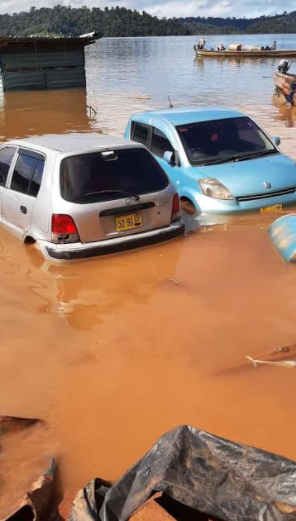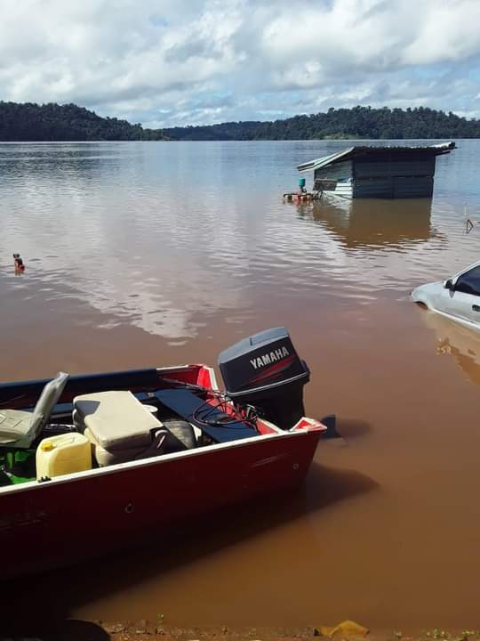 Afobaka (district Brokopondo), de aanmeerplaats om de boot te pakken naar het Boven Stuwmeer gebied, staat helemaal blank. Winkels, supermarkten en pompstations staan onder water.