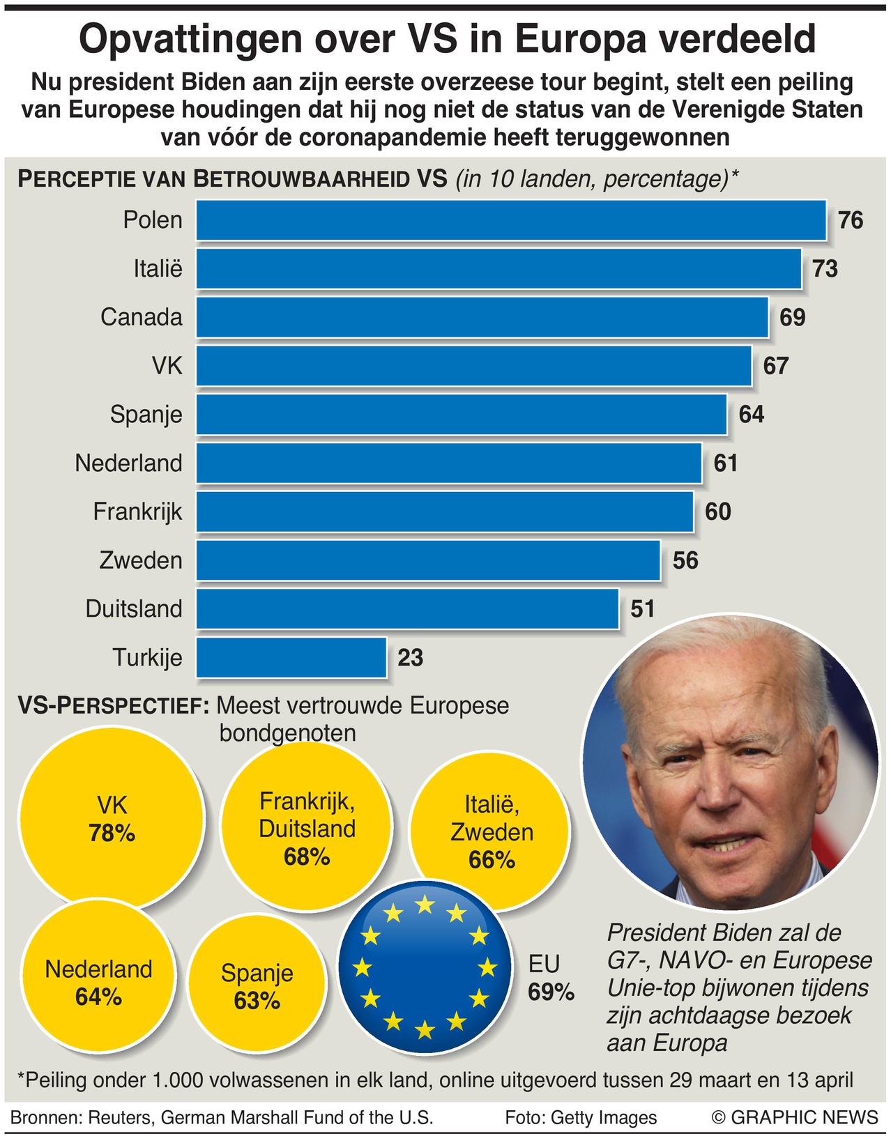 Biden begint woensdag aan zijn eerste Europese tournee als president om G7-, NAVO- en Europese Unie-toppen bij te wonen. Hij staat voor de uitdaging om de trans-Atlantische banden te herstellen die zijn beschadigd door zijn voorganger Donald Trump, wiens terugtrekking uit internationale overeenkomsten en scherpe kritiek op de NAVO het Europese vertrouwen in Washington ondermijnden, aldus Reuters.