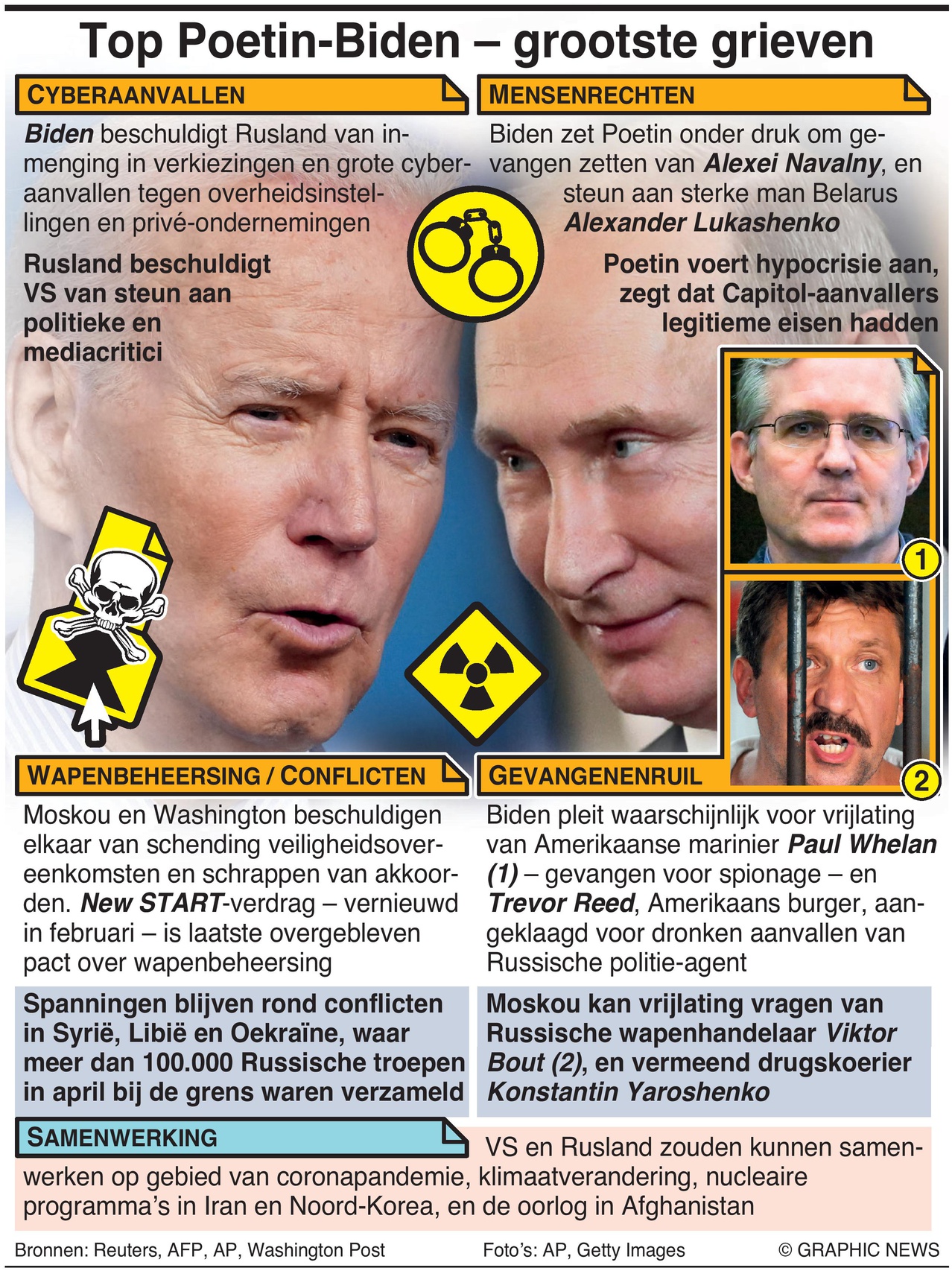 Op 16 juni heeft Biden in het Zwitserse Genève, ter afsluiting van zijn Europese reis, een topontmoeting met de Russische president Vladimir Poetin. Hij zal het daar onder meer hebben over de aanvallen van Russische hackers en de onrust in Oost-Oekraïne.