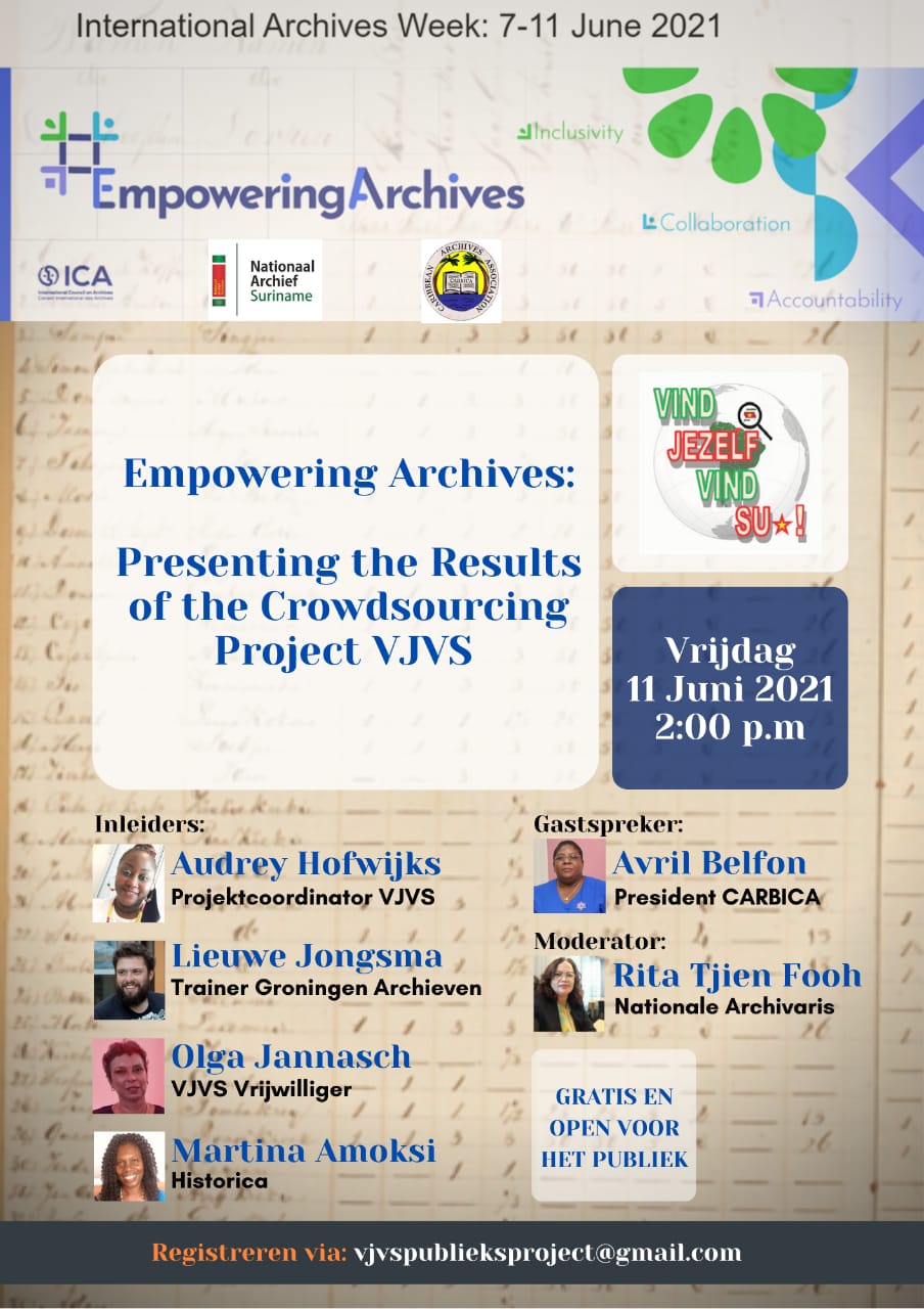 Het NAS heeft vrijdag 11 juni vanaf twee uur ‘s middags een webinar om de resultaten van het crowdsourcing project ‘Vind Jezelf Vind Su’ te presenteren aan het publiek. In november 2020 is dit project gelanceerd en tientallen vrijwilligers hebben zich opgegeven om via het softwareprogramma Transkribus (free trial versie) het archief van het commissariaat van de inlandse bevolking te transcriberen en redigeren. Tijdens de webinar zal het resultaat ook worden geanalyseerd door een historica. Het publiek kan zich nog aanmelden voor het bijwonen van de webinar door een email te sturen naar [email protected].