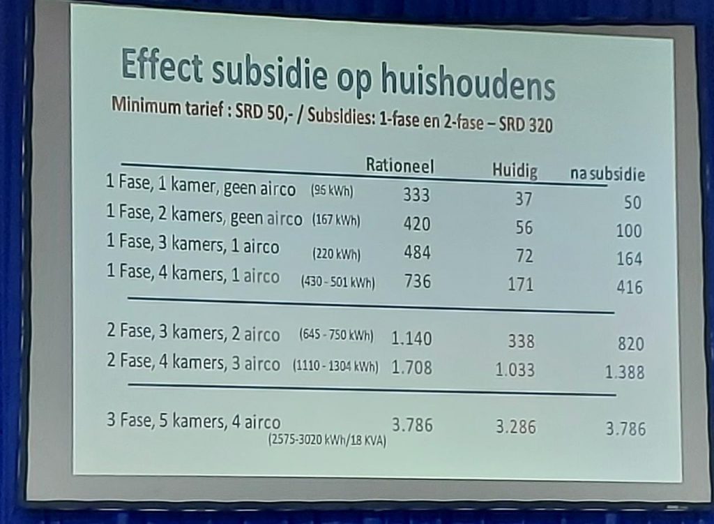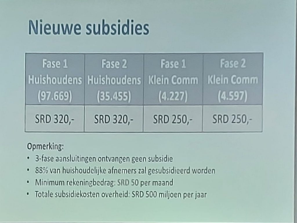 Met de invoering van de nieuwe tarievenmethodologie en subsidieregeling door de regering Santokhi-Brunswijk, subsidieert de overheid alleen nog de huishoudens die rechtmatig voor deze financiële steun in aanmerking komen en garandeert zij de levering van elektriciteit aan de samenleving op lang termijn binnen de betaalbare marges.