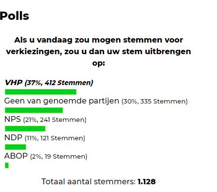 Uit de antwoorden van 1.128 stemmers wordt duidelijk, dat zo’n kwart van de kiezers, 335 stemmen, nu op geen enkele coalitiepartij zou stemmen. De uitkomst van de poll zou een helder signaal moeten zijn naar in ieder geval de coalitiepartijen VHP, NPS en ABOP en het tot nu gevoerde regeringsbeleid, dat ondersteund wordt door genoemde partijen.