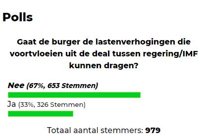 Ongeveer de helft van het aantal uitgebrachte stellen, 326 personen (33 procent), beantwoordde de vraag met een ‘ja’. Uit het aantal nee-stemmers zou overigens ook geconcludeerd kunnen worden, dat veel mensen op dit moment nog niet weten wat de deal met het IMF uiteindelijk gaat betekenen voor de portemonnee van de burger.