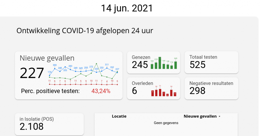 227 Personen zijn maandag positief getest (dat waren er woensdag 272, donderdag 233, vrijdag 253, zaterdag 311 en zondag 262) en 245 patiënten zijn genezen verklaard. 525 Testen zijn uitgevoerd.