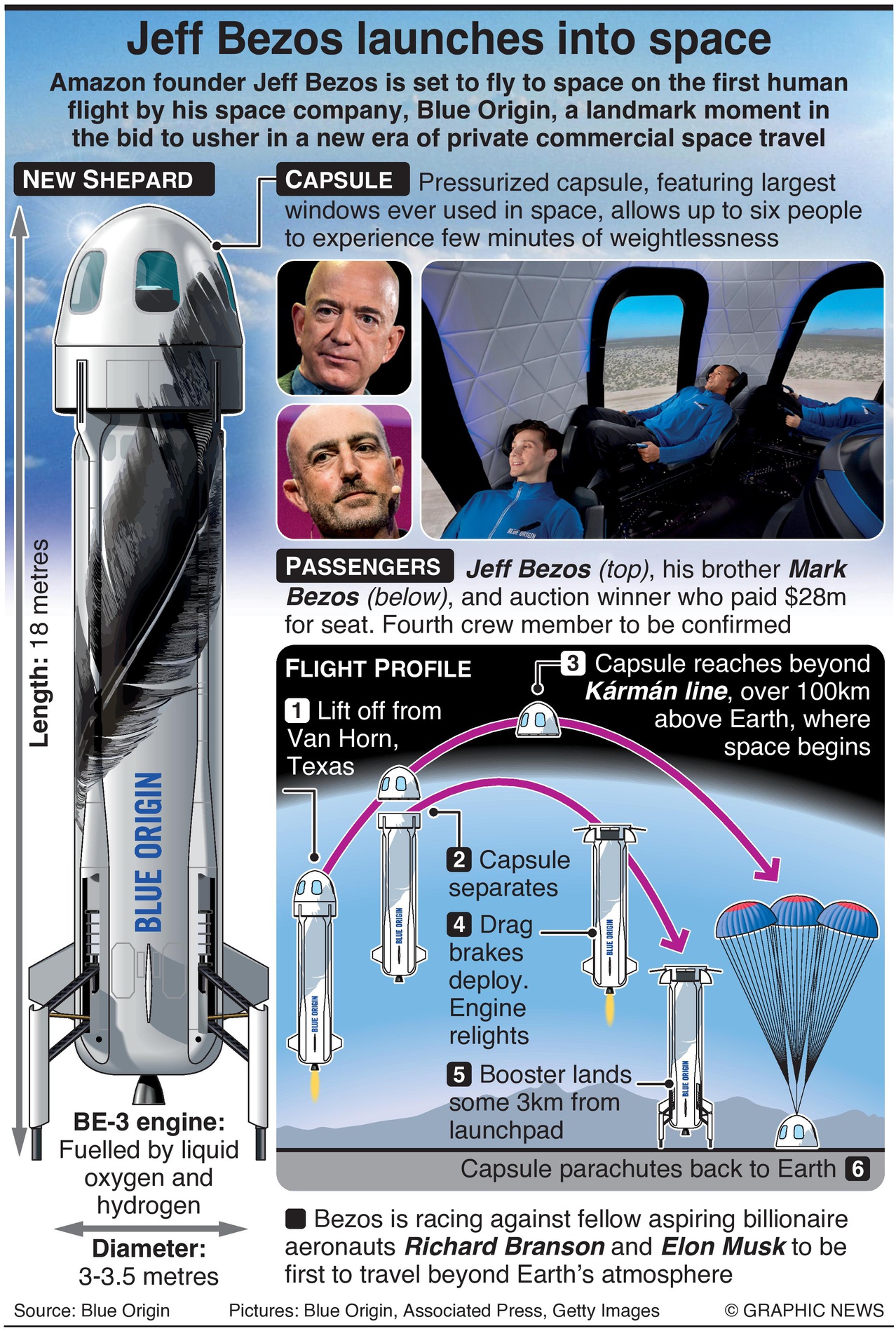 Hij noemt zijn broer Mark zijn ‘beste vriend’ met wie hij ‘het grootste avontuur’ onderneemt. De ruimtetocht zal plaatsvinden twee weken nadat Bezos aftreedt als CEO van Amazon.com om te worden opgevolgd door Andy Jassy.