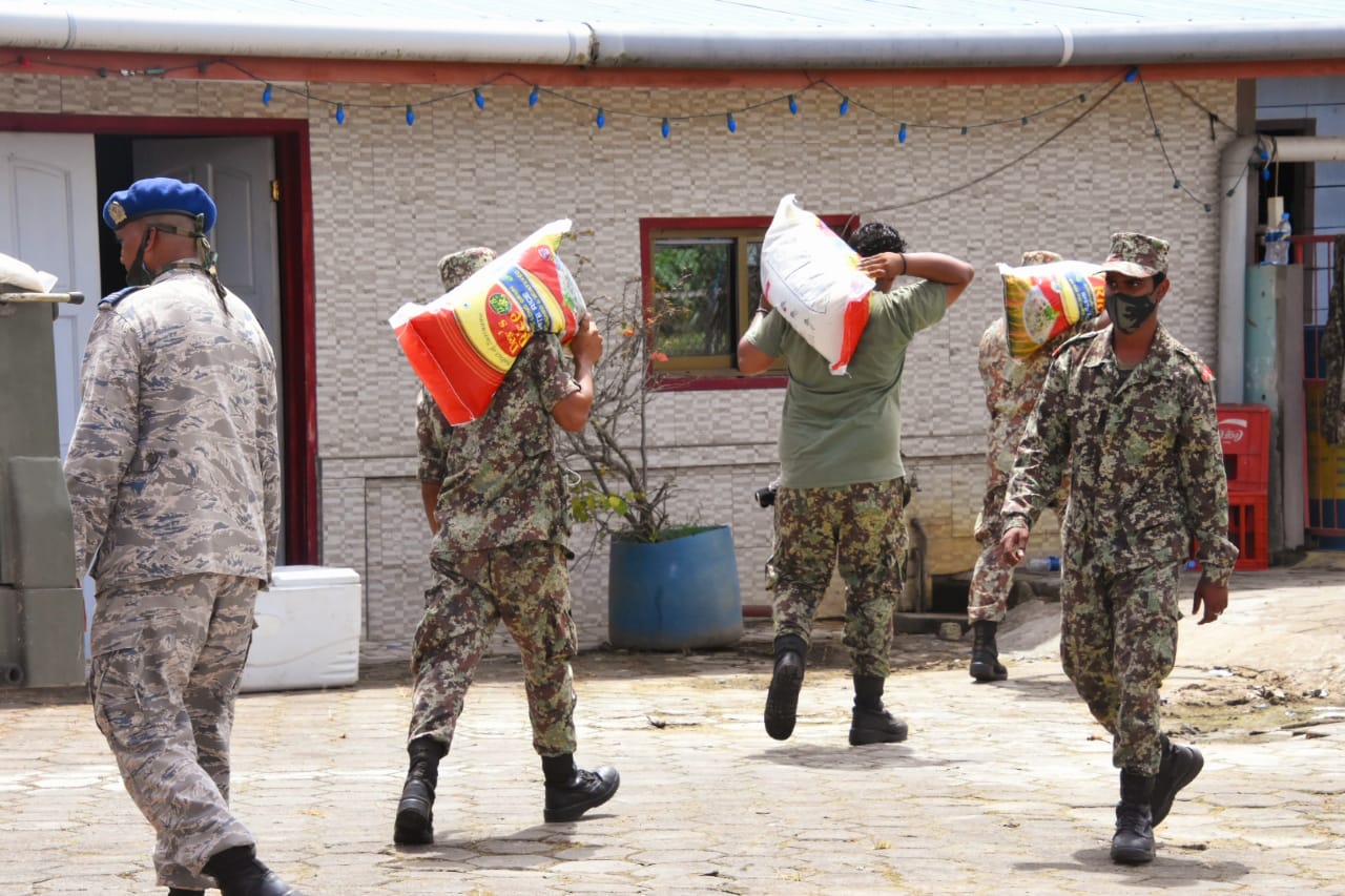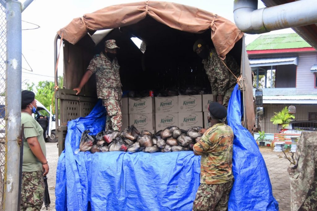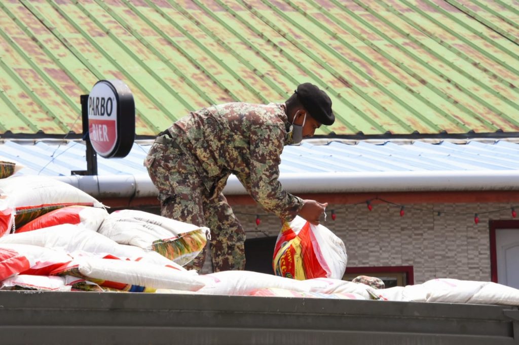 In Nieuw-Nickerie hebben militairen voedselpakketten ingeladen voor transport naar Apoera en Wageningen. Voor Apoera gaat het om 700 stuks die per ponton vervoerd zullen worden, terwijl er voor Wageningen 750 pakketten werden klaargelegd in een militaire vrachtwagen.