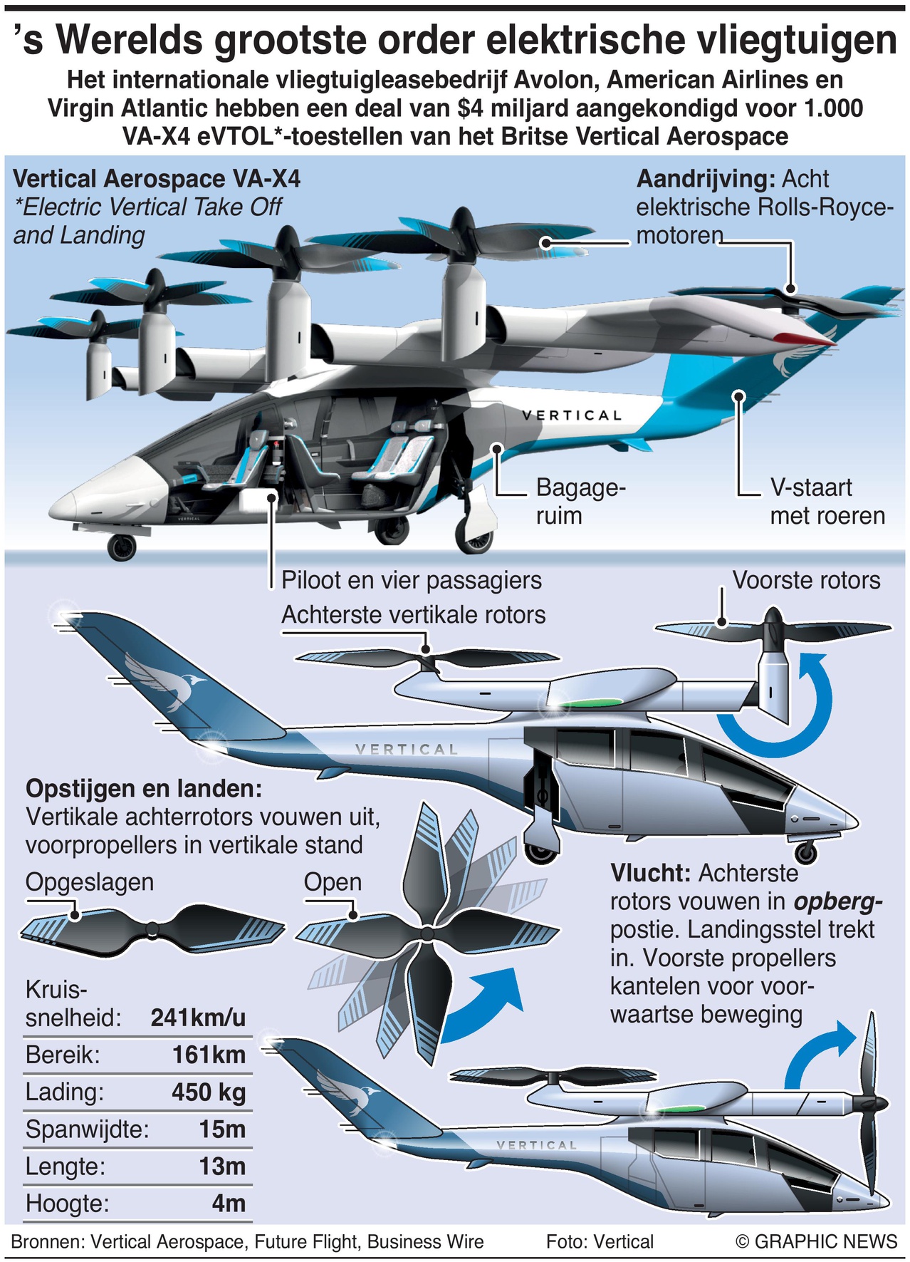 - De internationale vliegtuigleasemaatschappij Avolon, American Airlines en Virgin Atlantic hebben een deal van $ 4 miljard aangekondigd voor maximaal 1.000 VA-X4 elektrische Vertical Takeoff and Landing (eVTOL)-vliegtuigen van het Britse Vertical Aerospace.