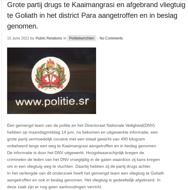 Hieromtrent bracht de Communicatie Dienst Suriname, CDS, maandag een persbericht uit. De voorlichtingsdienst van de regering gaf aan, dat na gedegen nationale en internationale voorbereiding in het Kaaimangrasi-gebied een grote hoeveelheid cocaïne in beslag was genomen. Het ging om in totaal 14 balen van vermoedelijk rond de 30 kilo per baal. Het gaat dus om een geschatte hoeveelheid van zo’n 490 kilo. In de omgeving werd een afgebrand vliegtuig ontdekt, dat vermoedelijk in verband gebracht kan worden met de onderschepte cocaïne. Aan de aanhouding van verdachten betrokken bij dit drugstransport wordt gewerkt, ,aldus de CDS.