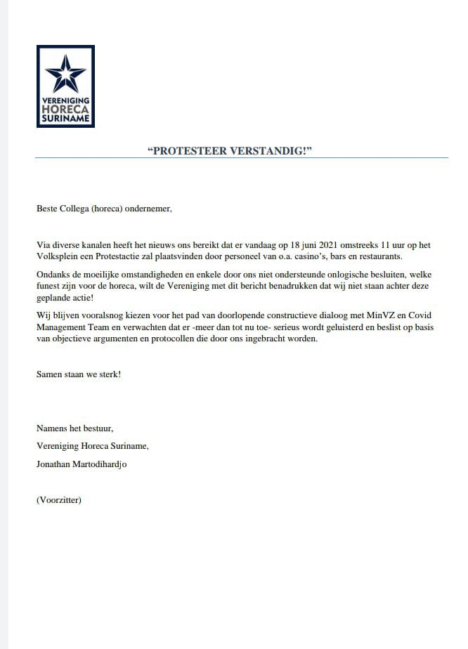 Volgens de voorzitter van de Vereniging Horeca Suriname, Jonathan Martodihardjo,in gesprek met Dagblad Suriname vrijdagochtend, hebben diverse leden van de vereniging de mededeling van het protest ontvangen en informeerden vervolgens het bestuur.