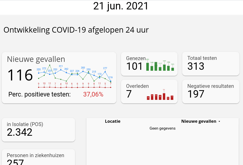 7 Covid-patiënten maandag 21 juni overleden en 116 personen positief getest op Covid-19