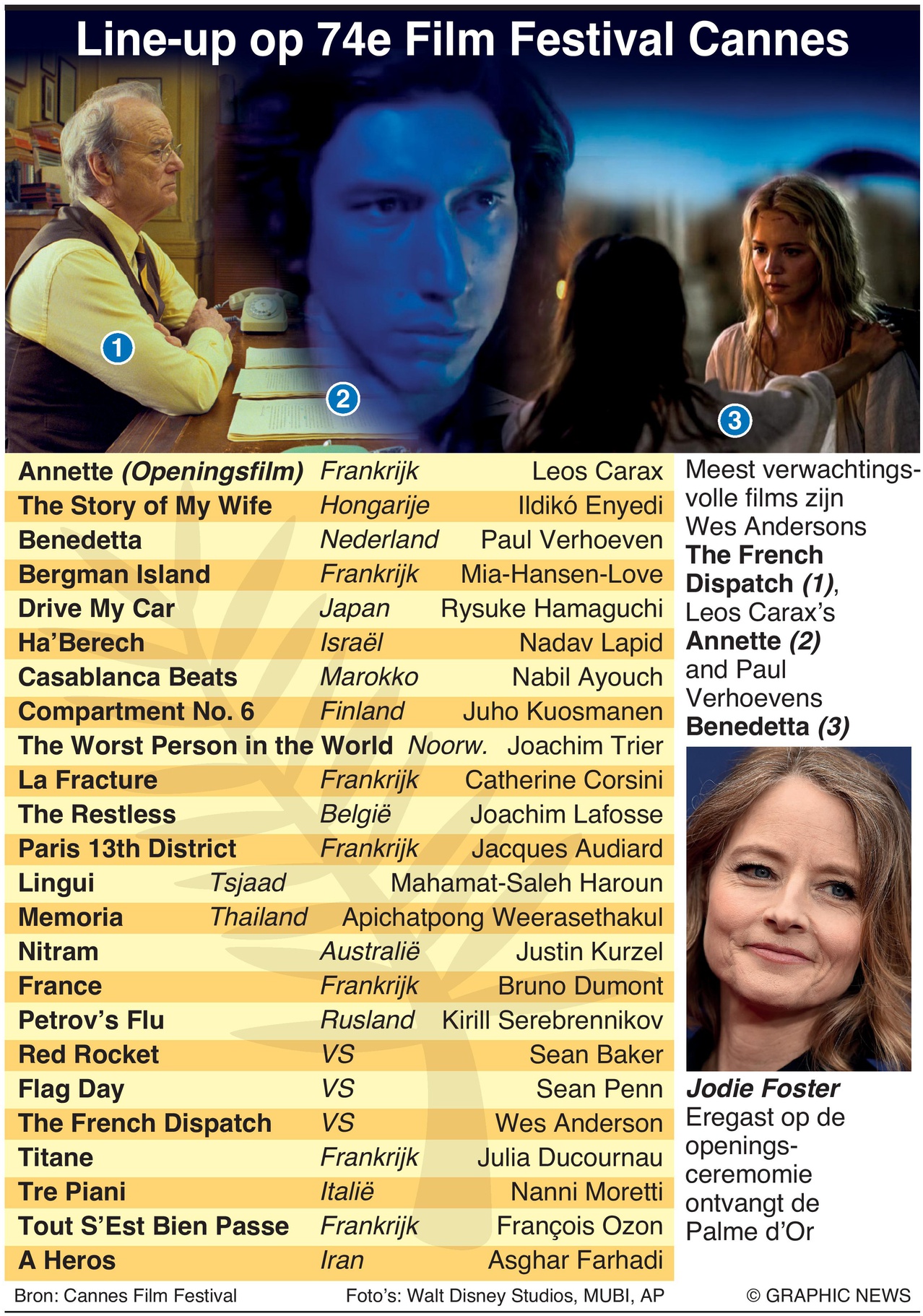 Some of the most anticipated films of this edition include Leos Carax’s musical romance “Annette” with Adam Driver and Marion Cotillard, which will kick off the festival; Verhoeven’s subversive period thriller “Benedetta,” set in the late 15th century and starring Virginie Efira as a novice nun; and “The French Dispatch,” Anderson’s 10th movie, with Tilda Swinton, Benicio del Toro, Bill Murray and Timothée Chalamet, among other stars.