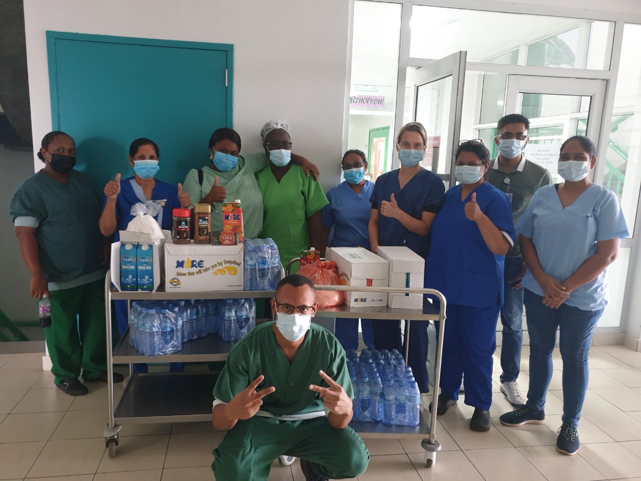 Direkteur Roy Radjbali overhandigde pakketten met koffie, water, suiker, melk,Ā sap en theeĀ aan de verpleegkundigen van de respectieve ziekenhuizen.Ā Hij sprak mede namens zijn staf zijn waardering uit voor hun liefdevol werk. ‘Hoe zou deze zorg eruit zien zonder zulke zusters en broeders?’
