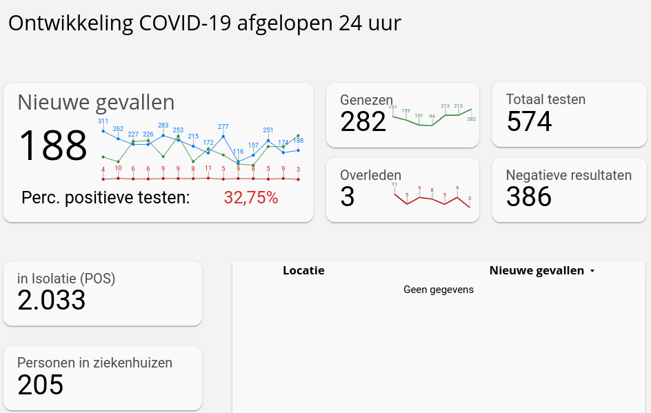 188 Personen zijn vrijdag positief getest (dat waren er zondag 277, maandag 116, dinsdag 157, woensdag 251 en donderdag 174) en 282 patiƫnten zijn genezen verklaard. 574 Testen zijn uitgevoerd.