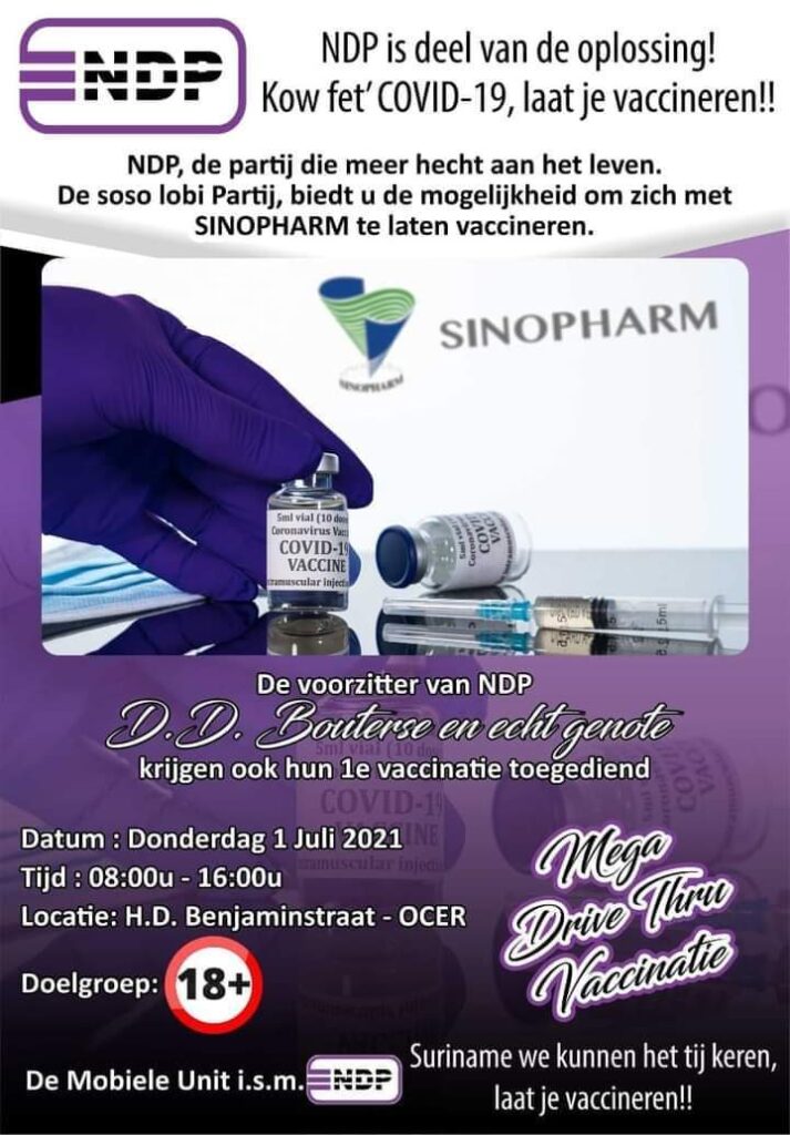 De NDP heeft aangekondigd, dat zij komende week een drive-thru vaccinatie dag vaccineren houdt, waarbij Sinopharm zal worden gebruikt. Op die dag zullen ook NDP-voorzitter Desi Bouterse en zijn echtgenote hun eerste vaccinatie toegediend krijgen, meldt de partij zaterdag 26 juni in onderstaand bericht.