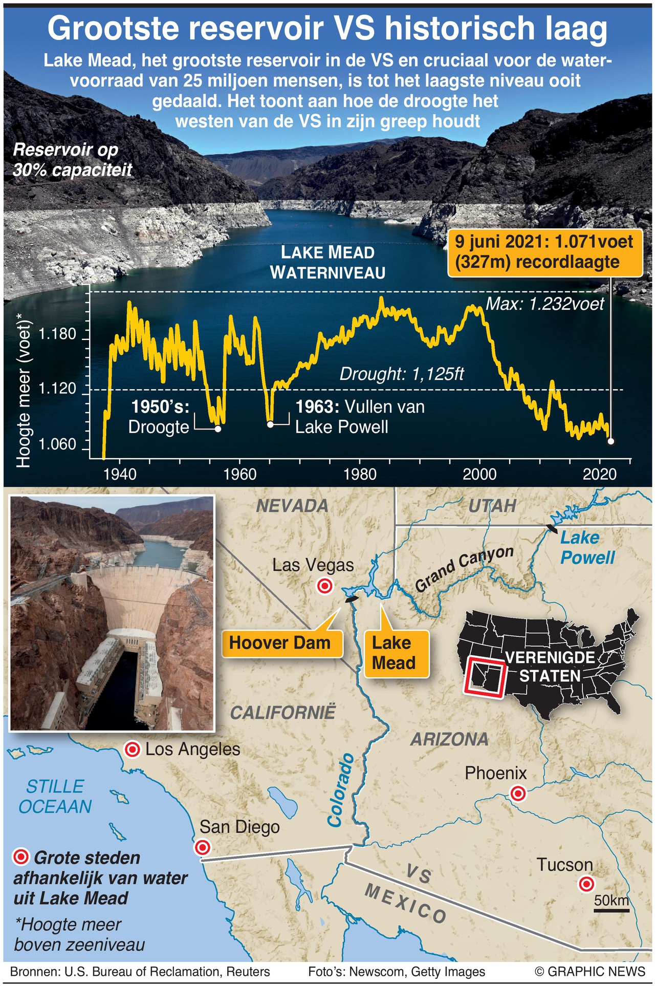 Lake Mead, het grootste stuwmeer in de VS en cruciaal voor de watervoorziening van 25 miljoen mensen, is gezonken tot het laagste niveau ooit, wat de extreme droogte in het westen van de VS benadrukt.