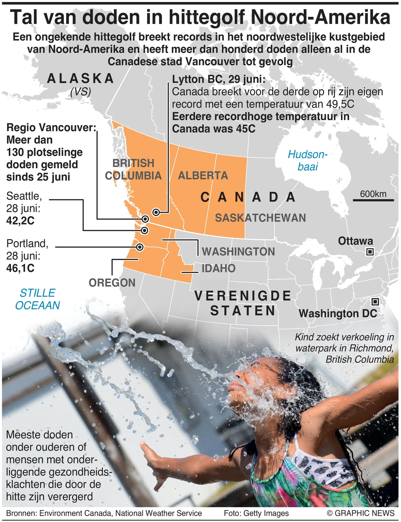 De temperaturen in de Amerikaanse steden in het noordwesten van de Stille Oceaan, Portland, Oregon en Seattle, Washington bereikten volgens de National Weather Service een niveau dat niet is gezien sinds het begin van de registratie in de jaren 1940: 46,1C in Portland en 108 in Seattle en 42,2C in Seattle. .
