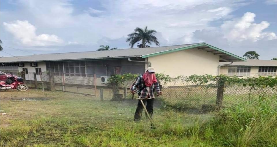 Het erf van de Anton Residaschool in het ressort Saramaccapolder is schoongemaakt door veldarbeiders van het commissariaat Wanica Noord-West, in verband met de opening van de scholen voor examenklassen.