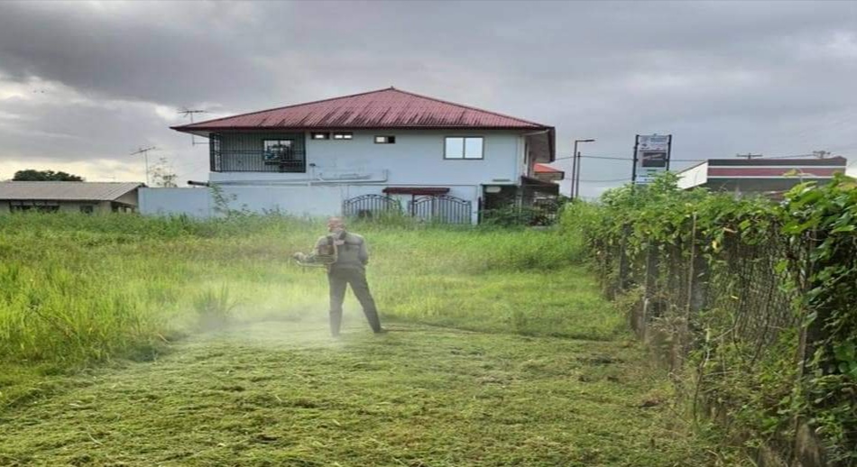 Het erf van deze school stond al een tijd onder hoog wied. Het commissariaat Wanica Noord-West hoopt hiermee een bijdrage te kunnen leveren voor een vlotte herstart van de school.