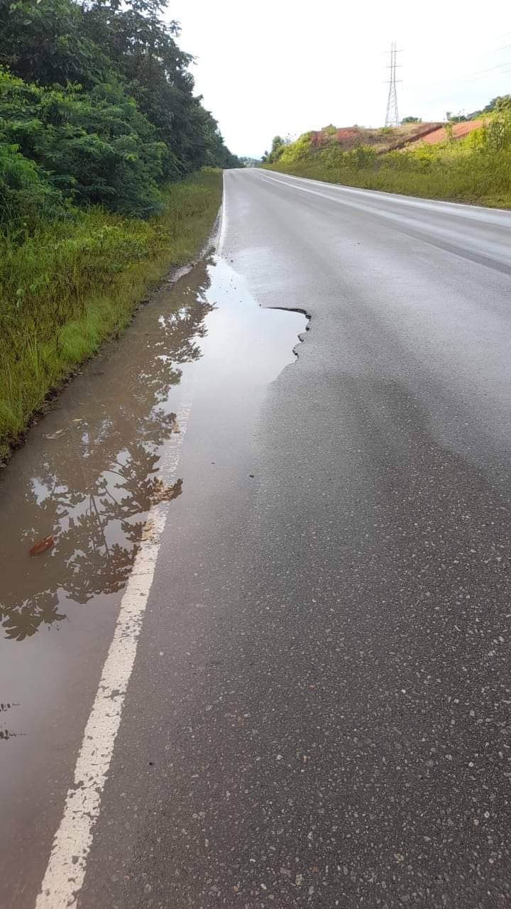 Ter hoogte van de brug over de Marchallkreek bevindt zich een groot gat in de Afobakaweg. Het gat levert een zeer gevaarlijke situatie op voor het wegverkeer.